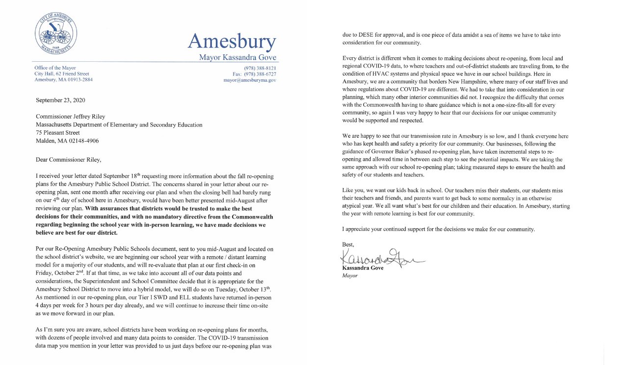 Mayor Kassandra Gove On Friday Afternoon I Received A Letter From Commissioner Riley Of The Department Of Elementary And Secondary Education Dese Asking What Amesbury S Plans Are For In Person Learning